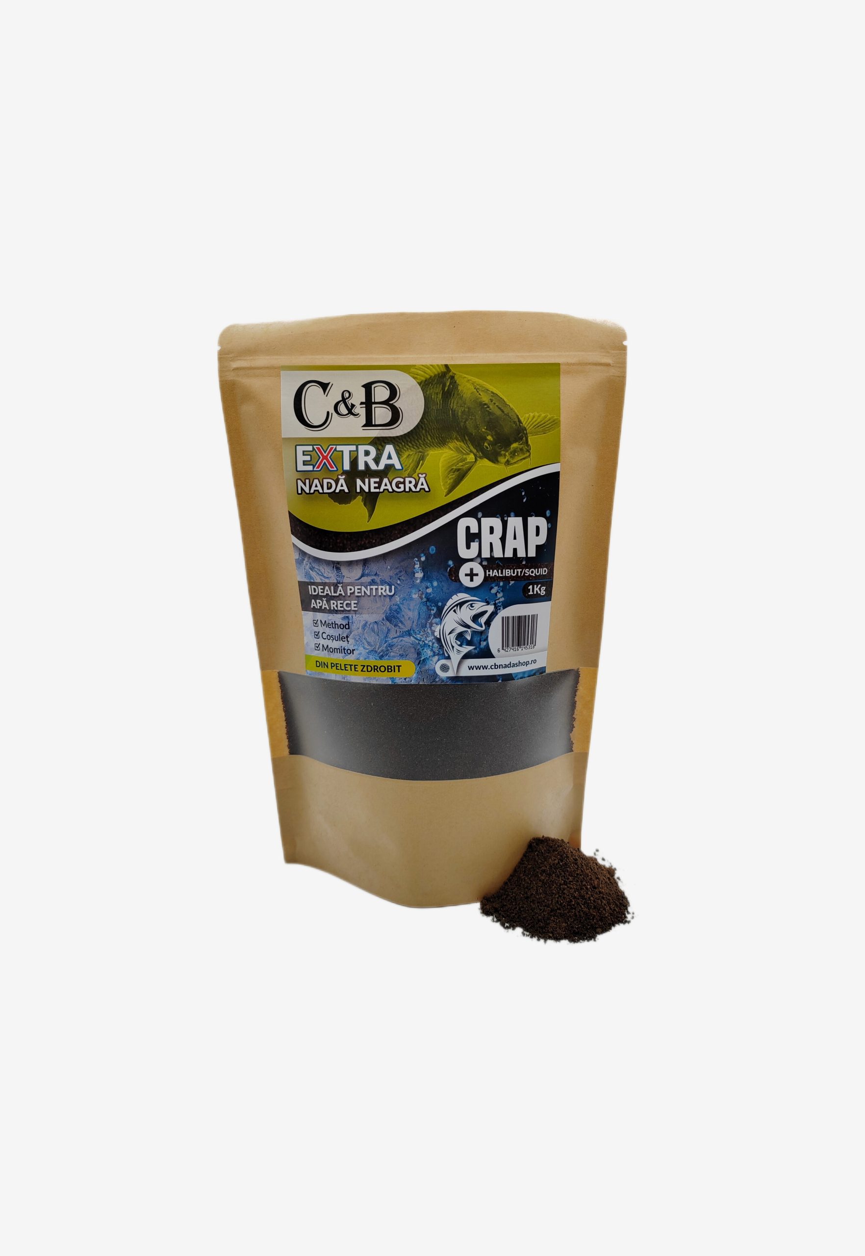 C&B Extra Crap Halibut Squid este o nada obtinuta din pelete zdrobit. Aceasta este recomandata in pescuitul cu momitoare, atat de tip method, cat si cu cosulete, pe ape reci. Textura fina si culoarea neagra o fac potrivita pentru pescuitul ciprinidelor pe timp de primavara si toamna. Nada C&B Extra Crap Halibut Squid are in compozitie aroma de halibut si squid, faina de peste, seminte de rapita, hemoglobina pulbere, melasa, distilat din cereale de grau, fosfat monocalcic, clorura de sodiu si carbonat de calciu.
